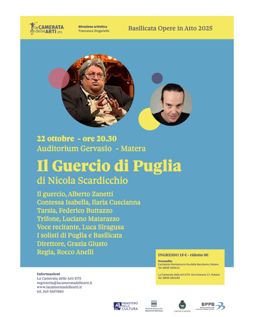 La Camerata delle Arti prosegue la sua Stagione Autunnale con un appuntamento di grande fascino e originalità: “Il Guercio di Puglia”, opera lirica del compositore barese Nicola Scardicchio, allievo prediletto di Nino Rota e figura tra le più colte e poliedriche del panorama musicale contemporaneo.