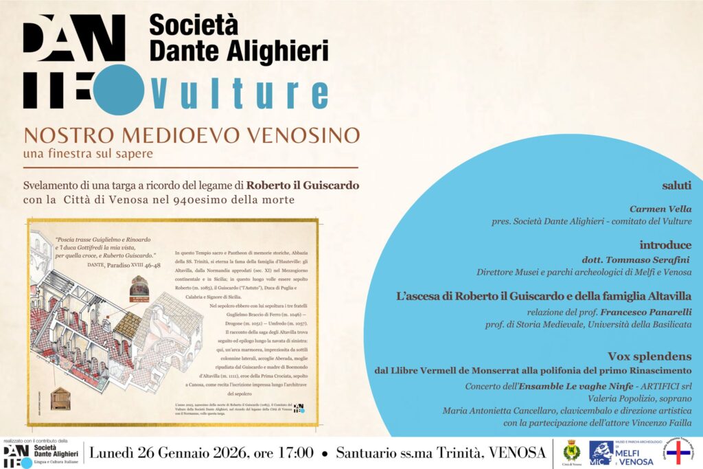 L’appuntamento, in programma alle ore 17.00 presso la Chiesa della SS.ma Trinità di Venosa, sarà inaugurato dallo svelamento di una targa commemorativa donata dal Comitato del Vulture in occasione del 940° anniversario della morte di Roberto il Guiscardo (2025) per suggellare il profondo legame tra il condottiero normanno, la sua famiglia e la Città di Venosa, divenuta, a ragione, mausoleo dinastico e simbolo della presenza normanna nel Sud Italia.