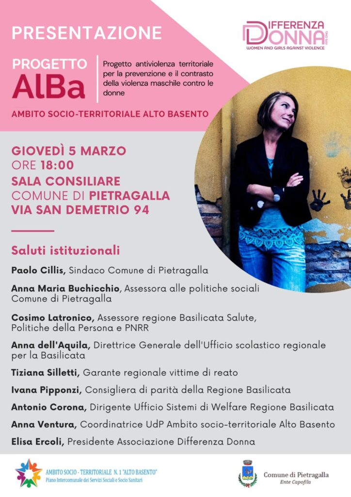 Si terrà giovedì 5 marzo alle ore 18:00, presso la Sala Consiliare del Comune di Pietragalla in via San Demetrio 94, la presentazione del Progetto AlBa, iniziativa territoriale di contrasto alla violenza di genere realizzata a livello locale nell’Ambito socio-territoriale Alto Basento e promosso da Differenza Donna APS in collaborazione con l’Ufficio di Piano, i Comuni dell’Ambito e la rete territoriale dei servizi pubblici e del terzo settore.