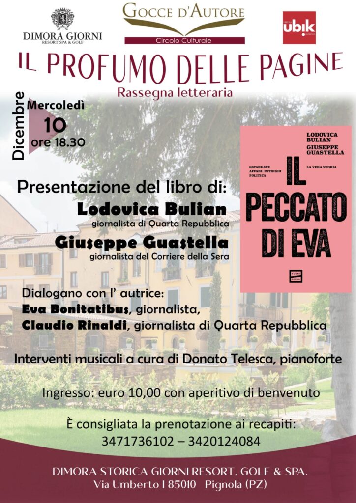 La rassegna letteraria Il Profumo delle pagine torna con un appuntamento imperdibile. Mercoledì 10 dicembre alle 18:30 presso le cantine della Dimora Storica Giorni Resort Spa & Golf di Pignola (PZ) si presenta Il peccato di Eva, RCS MediaGroup, il libro scritto a quattro mani dai giornalisti Lodovica Bulian, Quarta Repubblica, e Giuseppe Guastella, Corriere della Sera.