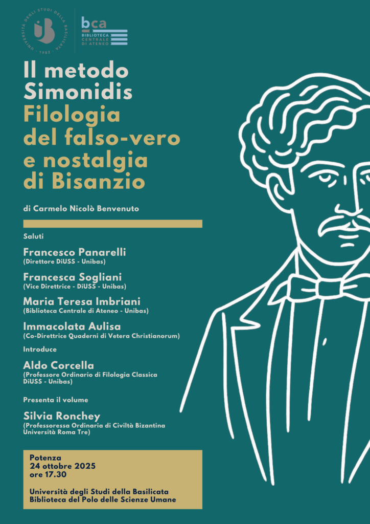 Venerdì 24 ottobre 2025, alle ore 17.30, la Biblioteca Centrale di Ateneo dell’Università degli Studi della Basilicata ospiterà la presentazione del volume “Il metodo Simonidis. Filologia del falso-vero e nostalgia di Bisanzio” (Edipuglia 2024), di Carmelo Nicolò Benvenuto, ricercatore post-doc in Unibas, esperto di paleografia greca e bizantinistica.