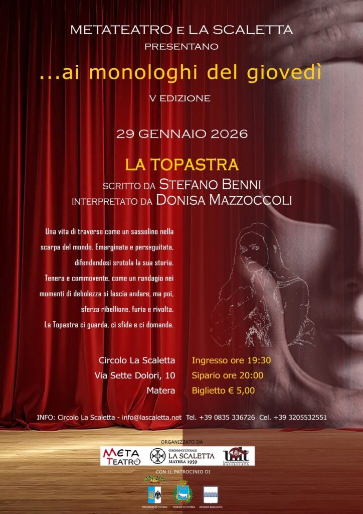 Giovedì 29 gennaio alle ore 20 nella sede del Circolo La Scaletta a Matera in via Sette Dolori 10 e sabato 31 gennaio, sempre alle ore 20, nella sala consiliare di Pomarico, prosegue la rassegna teatrale “…ai monologhi”, giunta alla quinta edizione, promossa da Metateatro e dal Circolo Culturale La Scaletta.