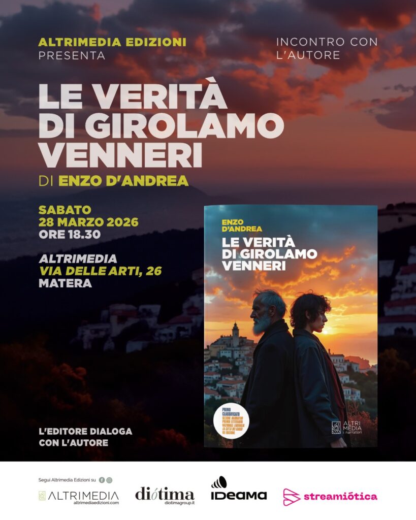 Altrimedia Edizioni presenta sabato 28 marzo alle ore 18.30 presso la sua sede, in via delle Arti 26 a Matera, il romanzo di Enzo D’Andrea, dal titolo “Le verità di Girolamo Venneri” vincitore della VII edizione della sezione Narrativa del Premio letterario nazionale Liberalia “La città dei Sassi”. Un’opera intensa che intreccia il genere noir con la ricerca storica, portando il lettore nel cuore di un mistero che affonda le radici nella Seconda Guerra Mondiale.