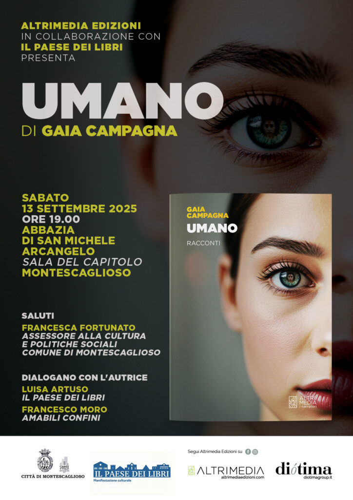 Atrimedia Edizioni, in collaborazione con Il Paese dei Libri e il patrocinio del Comune di Montescaglioso, presenta sabato 13 settembre alle ore 19, presso la Sala del Capitolo dell’Abbazia di San Michele Arcangelo di Montescaglioso, “Umano” di Gaia Campagna. Dopo i saluti dell’assessore alla Cultura e alle Politiche sociali del Comune, Francesca Fortunato, e della direttrice editoriale, Gabriella Lanzillotta, l’autrice dialogherà con Luisa Artuso (Il Paese dei Libri) e Francesco Moro (Amabili Confini).