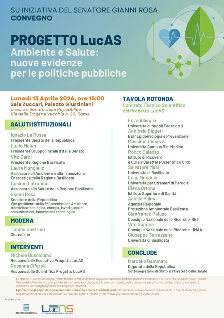A Roma il prossimo appuntamento di LucAS, con il convegno “PROGETTO LucAS Ambiente Salute: nuove evidenze per le politiche pubbliche”, che porterà in Senato le tematiche affrontate da LucAS. L’appuntamento è per lunedì 13 Aprile, ore 15:00 Sala Zuccari, Palazzo Giustiniani presso il Senato della Repubblica Via della Dogana Vecchia n. 29, Roma su iniziativa del Senatore Gianni Rosa – Vicepresidente della 8ª Commissione Ambiente, transizione ecologica, energia, lavori pubblici, comunicazioni, innovazione tecnologica.