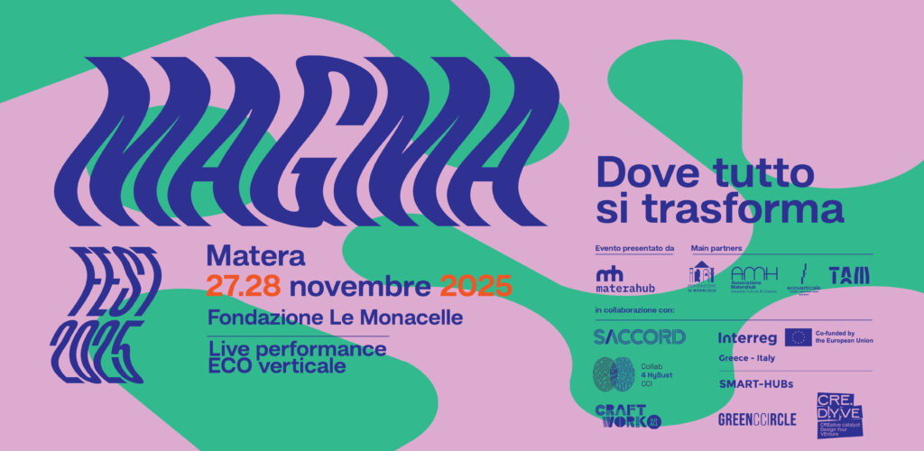 Matera torna ad essere laboratorio di innovazione culturale con la quarta edizione di MAGMA Fest, il festival organizzato da Materahub che mette la creatività al centro dei processi di trasformazione sociale, economica e tecnologica. Il 27 e 28 novembre, in due luoghi iconici della città – Fondazione Le Monacelle ed ECO Verticale – esperti, istituzioni, artisti, imprese, creativi e ricercatori si confronteranno sulle sfide più urgenti del nostro tempo: dalla doppia transizione ecologica e digitale all’evoluzione degli ecosistemi culturali.