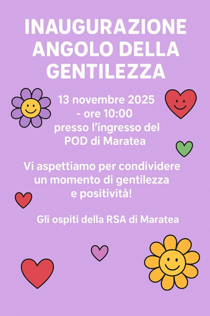 Il POD di Maratea sarà il primo presidio sanitario della Basilicata ad organizzare questa iniziativa, segno concreto di un impegno condiviso verso la costruzione di una comunità più empatica e solidale. Gli Angoli della Gentilezza sono spazi fisici e simbolici da cui poter diffondere messaggi, pensieri e azioni gentili: luoghi dove le persone entrano in connessione profonda con empatia e da cui possono nascere sorrisi, chiacchiere, progetti e doni.