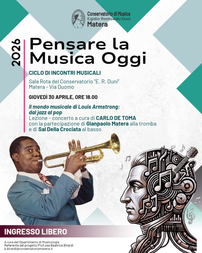 L’ingresso è libero. L’incontro è aperto a studenti, studiosi, musicisti e appassionati, confermando il ruolo del Conservatorio di Matera come centro attivo di produzione culturale e di alta formazione.