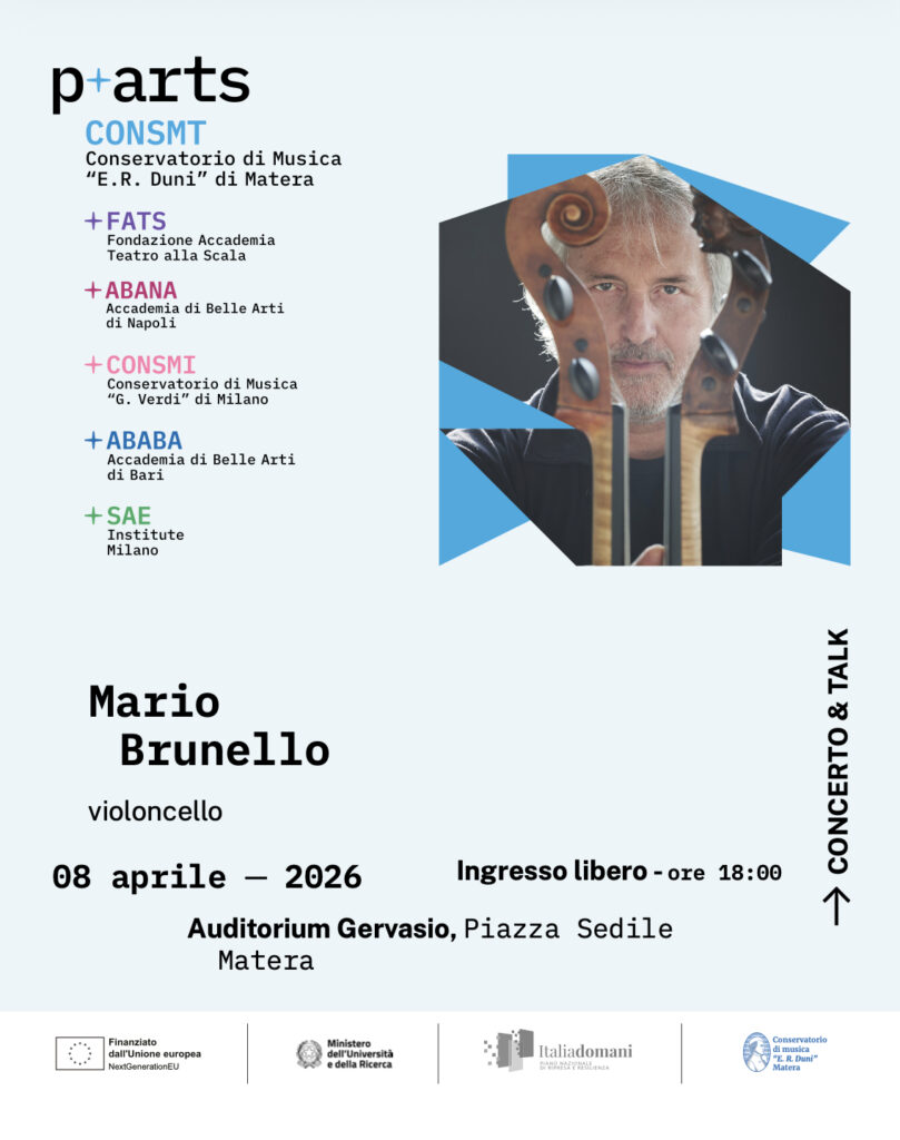 In linea con le finalità del progetto PNRR P+ARTS, la presenza di Mario Brunello non si esaurisce nel concerto: l’artista incontrerà infatti gli studenti del Conservatorio e il pubblico, offrendo un’importante occasione di dialogo, approfondimento e trasmissione diretta dell’esperienza artistica.