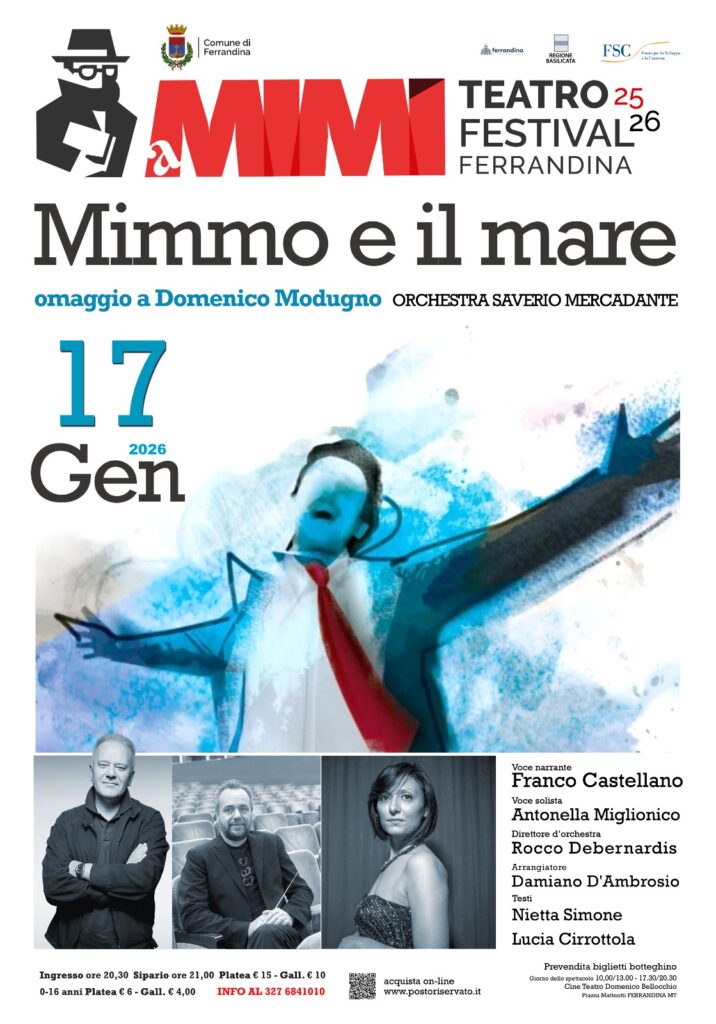 Sabato 17 gennaio 2026, il Cine Teatro Domenico Bellocchio di Ferrandina ospiterà un appuntamento imperdibile della stagione “Teatro Festival Ferrandina-A Mimì”: “Mimmo e il Mare”, un emozionante omaggio a Domenico Modugno, l’artista che ha rivoluzionato la musica italiana nel mondo.