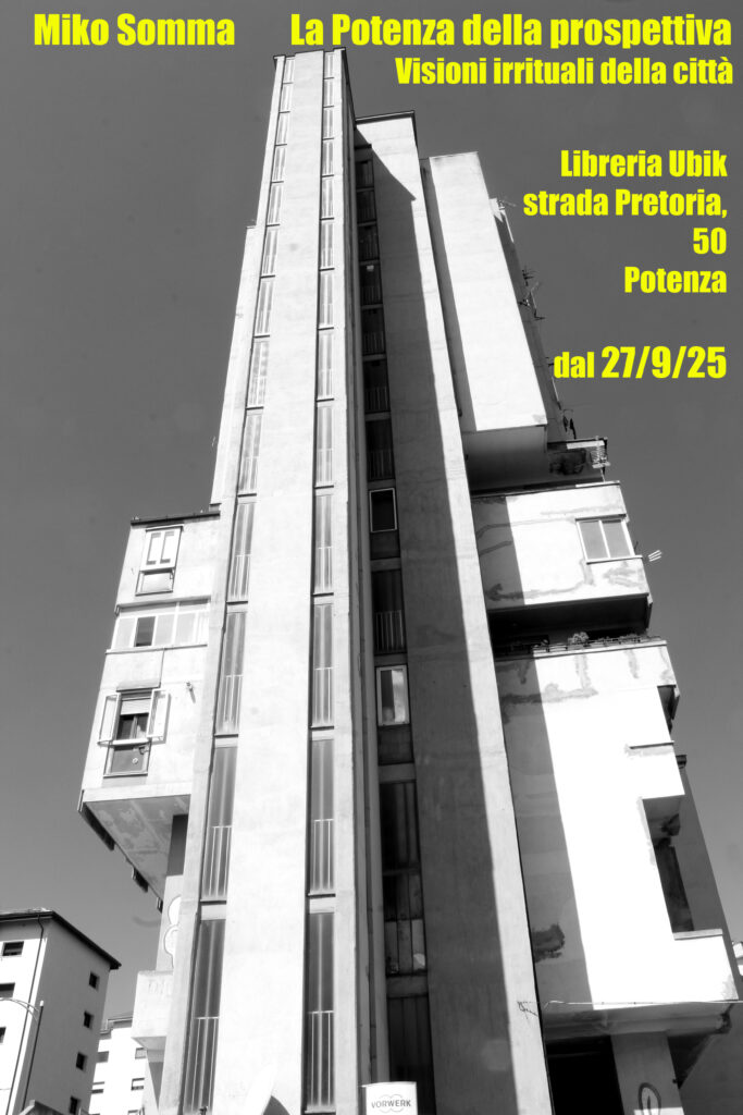 La mostra Fotografica “La Potenza della prospettiva – Visioni irrituali della città” di Michele “Miko” Somma, che si terrà presso la libreria Ubik in strada Pretoria, 50, a Potenza, a partire dal 27 cm, comincia proprio dal calembour usato come titolo a definire il suo ambito, meglio chiarito poi dal sottotitolo, osservare Potenza in modo diverso dal consueto per percepirne un’altra visione.