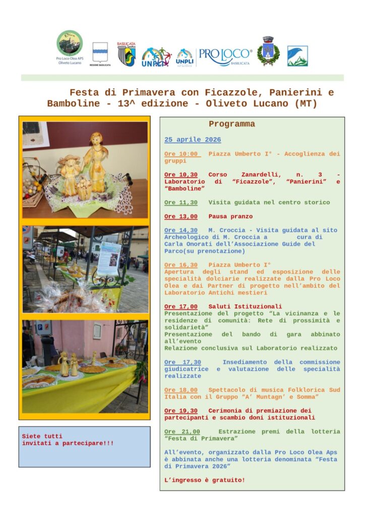 La Festa di Primavera avrà inizio sabato 25 aprile alle ore 10 con l’accoglienza dei gruppi in Piazza Umberto I°. Alle 10.30 in Corso Zanardelli ci sarà il laboratorio di “ficazzole”, “panierini” e “bamboline” e alle 11.30 la visita del centro storico. Dopo la pausa pranzo è prevista alle ore 14.30 la visita al sito archeologico situato a Monte Croccia a cura di Carla Onorati dell’Associazione Guide del Parco. Dalle 16.30 in Piazza Umberto I° apertura degli stand ed esposizione delle specialità dolciarie realizzate dalla Pro Loco Olea e dai partner di progetto nell’ambito del Laboratorio “Antichi mestieri”. Alle 17 è in programma la presentazione del progetto regionale “La vicinanza e le residenze di comunità: rete di prossimità e solidarietà” che punta a creare nell’area del Bradano – Medio Basento una rete inclusiva per ridurre le disuguaglianze attraverso la promozione della cultura e del volontariato e i legami sociali.