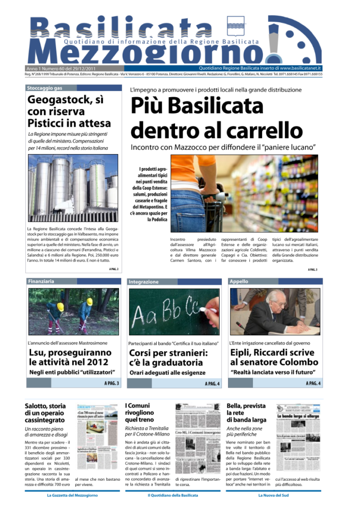 Basilicata Mezzogiorno è il quotidiano web scaricabile edito dalla Regione Basilicata che completa l’offerta di Basilicatanet, alla cui testata è allegato.