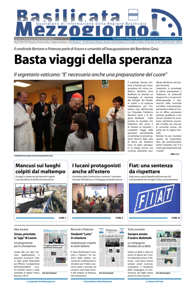In primo piano, nell’edizione odierna di Basilicata Mezzogiorno: la visita del cardinale Bertone al Centro Bambino Gesù del San Carlo ed il sopralluogo dell'assessore Mancusi sulle aree colpite dal maltempo.