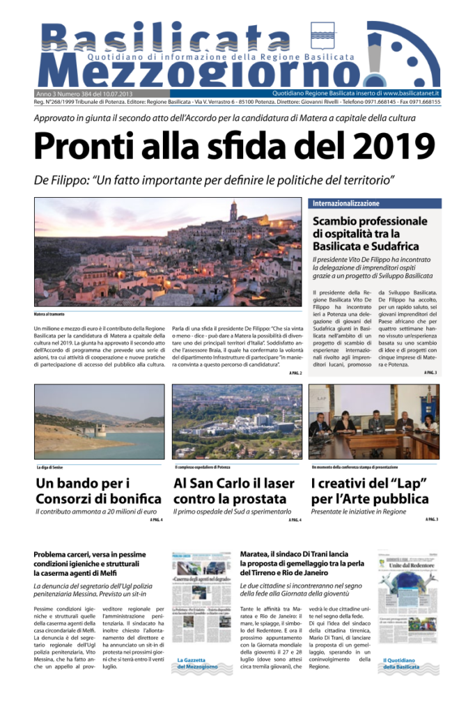 Basilicata Mezzogiorno è il quotidiano web scaricabile edito dalla Regione Basilicata che completa l’offerta di Basilicatanet, alla cui testata è allegato.