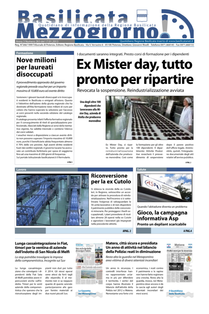 Basilicata Mezzogiorno è il quotidiano web scaricabile edito dalla Regione Basilicata che completa l’offerta di Basilicatanet, alla cui testata è allegato.