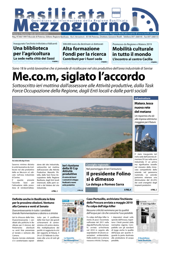 Basilicata Mezzogiorno è il quotidiano web scaricabile edito dalla Regione Basilicata che completa l’offerta di Basilicatanet, alla cui testata è allegato.