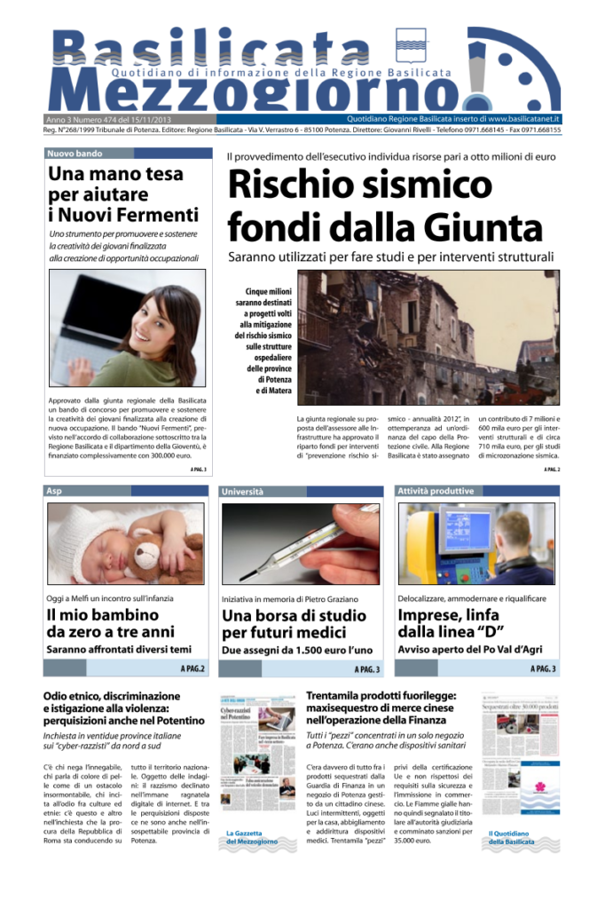 Basilicata Mezzogiorno è il quotidiano web scaricabile edito dalla Regione Basilicata che completa l’offerta di Basilicatanet, alla cui testata è allegato.