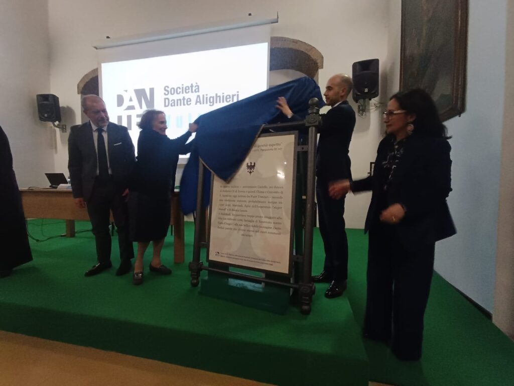 Di rilievo, gli interventi nel corso della serata. Tommaso Serafini, direttore dei Musei e Parchi archeologici di Melfi e Venosa ha sottolineato “il valore di iniziative capaci di coniugare rigore scientifico, valorizzazione del patrimonio e restituzione pubblica della memoria storica, evidenziando il ruolo centrale di Venosa nella comprensione della stagione sveva nel Mezzogiorno”. Il professor Fulvio Delle Donne, ordinario di Letteratura latina medievale all’Università degli Studi di Napoli Federico II, ha delineato invece il profilo di Manfredi come “re sapiente”, figura emblematica “di un Medioevo complesso, segnato dall’intreccio tra potere e sapere e dalle tensioni tra Impero e Papato”. A seguire, l’architetto Martino Bonifacio ha illustrato “i significativi ritrovamenti emersi durante i lavori di restauro e consolidamento dell’edificio”. Nel corso della serata, il comitato del Vulture della Società Dante Alighieri ha donato una targa commemorativa ai Padri Trinitari.