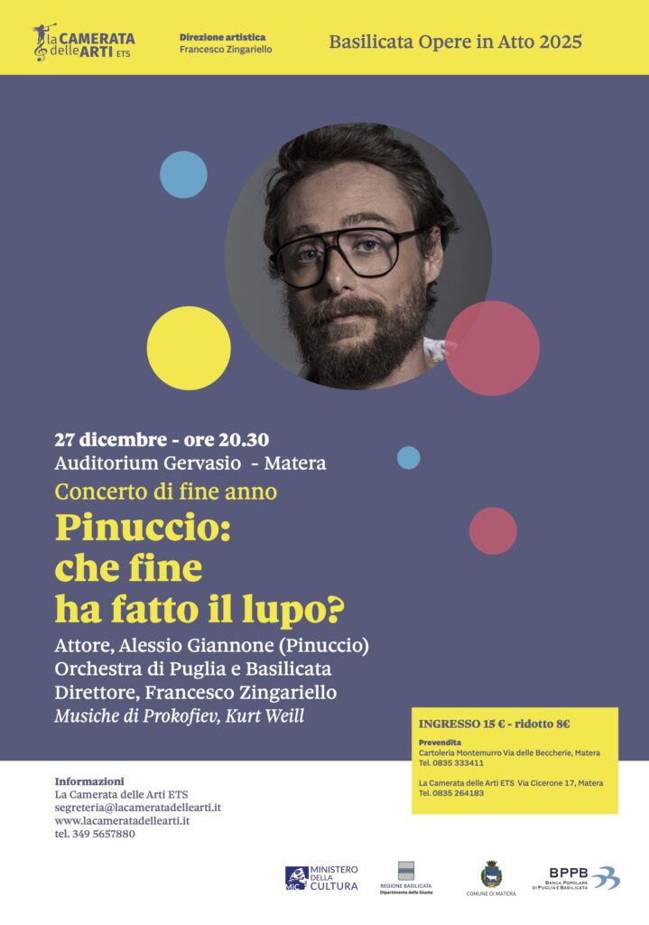 Sarà un appuntamento di grande suggestione e originalità quello in programma sabato 27 dicembre alle ore 20.30, all’Auditorium Gervasio di Matera, per l’appuntamento promosso dalla Camerata delle Arti. In scena lo spettacolo “Pinuccio: che fine ha fatto il lupo?”, che unisce musica sinfonica, narrazione e satira, ripensando in chiave contemporanea la celebre fiaba musicale Pierino e il lupo di Sergej Prokofiev.