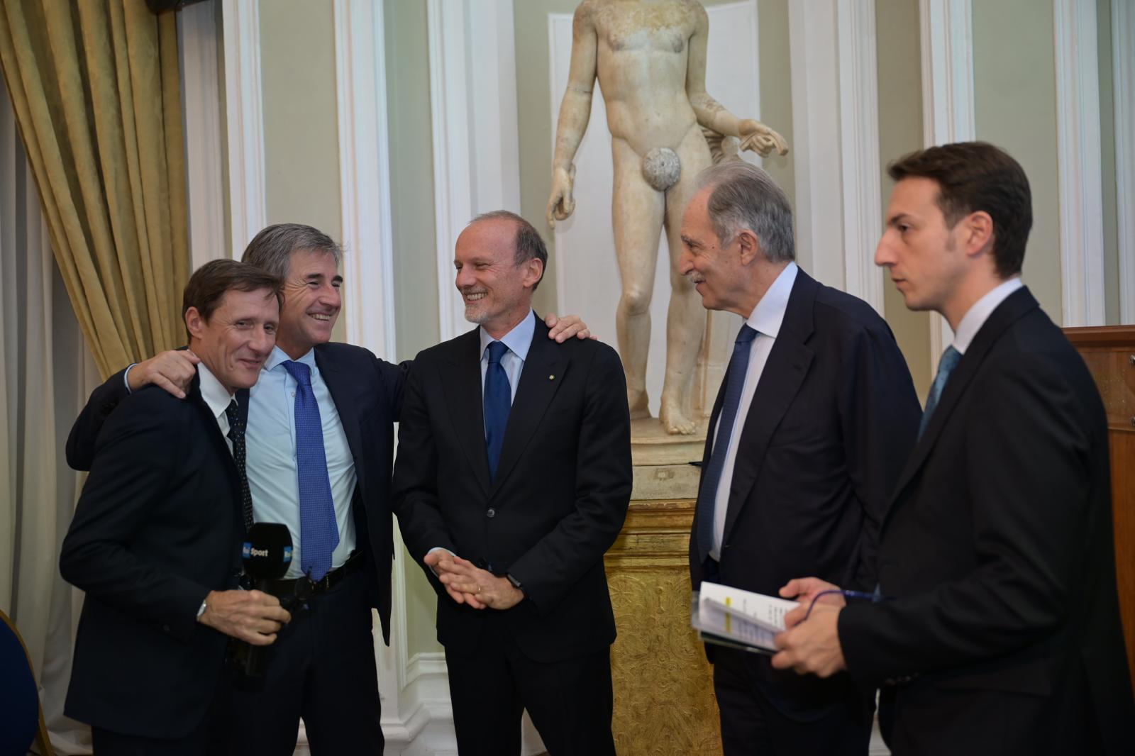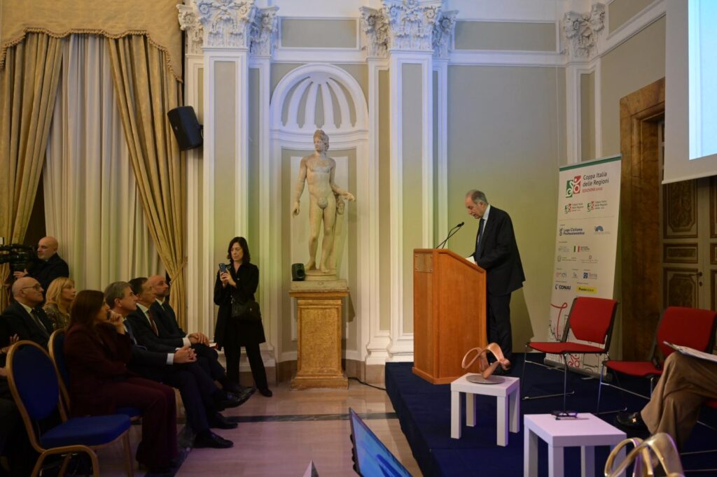 La Sala delle Statue di Palazzo Rospigliosi a Roma ha ospitato oggi la cerimonia di premiazione della Coppa Italia delle Regioni 2025, l’avvincente challenge ciclistica promossa dalla Lega del Ciclismo Professionistico e dalla Conferenza delle Regioni. L’evento ha visto la partecipazione dei Ministri Andrea Abodi (Sport e Giovani), Eugenia Roccella (Famiglia, Natalità e Pari opportunità) e Daniela Santanché (Turismo). All’iniziativa è intervenuto anche il Presidente della Regione Basilicata e Coordinatore della Commissione Sport della Conferenza delle Regioni, Vito Bardi. In veste di delegato della Conferenza delle Regioni, Bardi ha celebrato la manifestazione come un modello di successo che va oltre la competizione sportiva e si configura come una “narrazione dell’Italia reale”. “La Coppa Italia delle Regioni è molto più di una competizione: è la rappresentazione dell’Italia dei territori, delle comunità e delle società sportive che ogni giorno fanno crescere i nostri giovani”, ha sottolineato Bardi che ha portato i saluti del Presidente Fedriga.