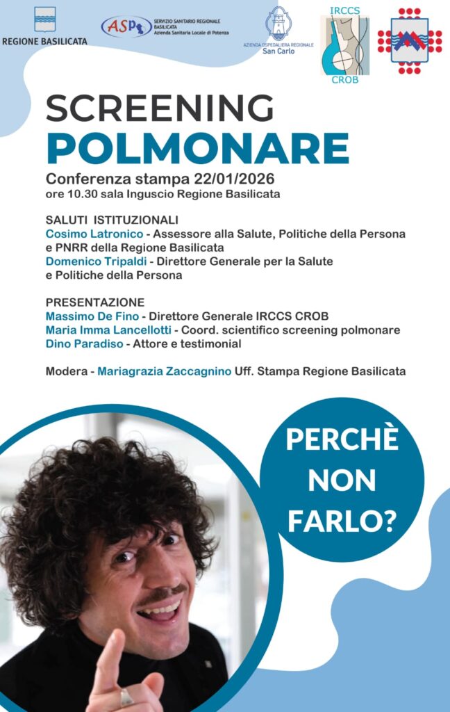 Rafforzare la prevenzione e anticipare la diagnosi delle patologie neoplastiche: con questo obiettivo nasce il nuovo programma di Screening polmonare della Regione Basilicata. L’iniziativa verrà presentata ufficialmente giovedì 22 gennaio 2026, alle 10.30, nella Sala Inguscio a Potenza. Il progetto, coordinato dall’IRCCS CROB di Rionero in Vulture, si avvale di un finanziamento di 490.000 euro annui a valere sul Fondo Sanitario Regionale per l’attuazione di obiettivi di piano prioritari e di rilievo nazionale. Il programma è rivolto a una platea potenziale di circa 195.572 cittadini lucani nella fascia d’età 50-74 anni. L’esame cardine dello screening è la TC del torace a basso dosaggio, strumento fondamentale per individuare lesioni neoplastiche in fase precoce. Durante la conferenza stampa saranno illustrati i dettagli operativi del progetto, le modalità di accesso dei cittadini e l’importanza della prevenzione sintetizzata nel claim della campagna: “Perché non farlo?”.