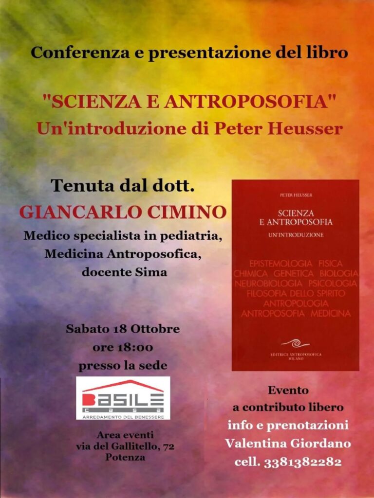 Sabato 18 ottobre alle ore 18, presso lo spazio eventi Experience di Rossella Capobianco, all’interno di Basile Casa in via del Gallitello 72 a Potenza, si terrà la presentazione del volume “Scienza e Antroposofia”. Un’introduzione di Peter Heusser. L’incontro, a ingresso libero, vedrà l’intervento del dott. Giancarlo Cimino, medico pediatra e specialista in Medicina Antroposofica, membro di SIMA – Società Italiana di medicina Antroposofica.