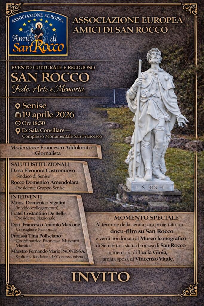 Si terrà domenica 19 aprile 2026, alle ore 18:30, presso l’Ex Sala Consiliare del Complesso Monumentale San Francesco di Senise, l’evento culturale e religioso dal titolo “San Rocco – Fede, Arte e Memoria”, promosso dall’Associazione Europea Amici di San Rocco.