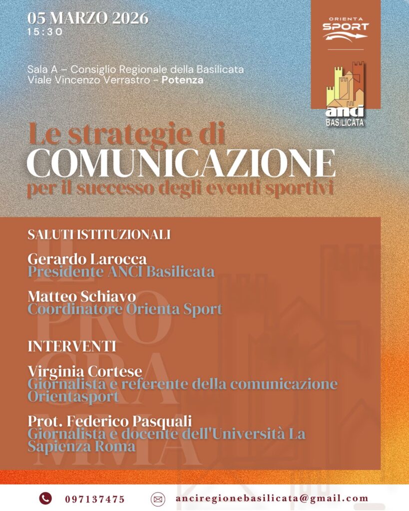L’iniziativa, promossa da ANCI Basilicata in collaborazione con Orienta Sport, nasce dalla volontà di fornire agli amministratori locali, ai dirigenti sportivi e agli addetti ai lavori gli strumenti necessari per valorizzare le eccellenze agonistiche e territoriali attraverso i media.