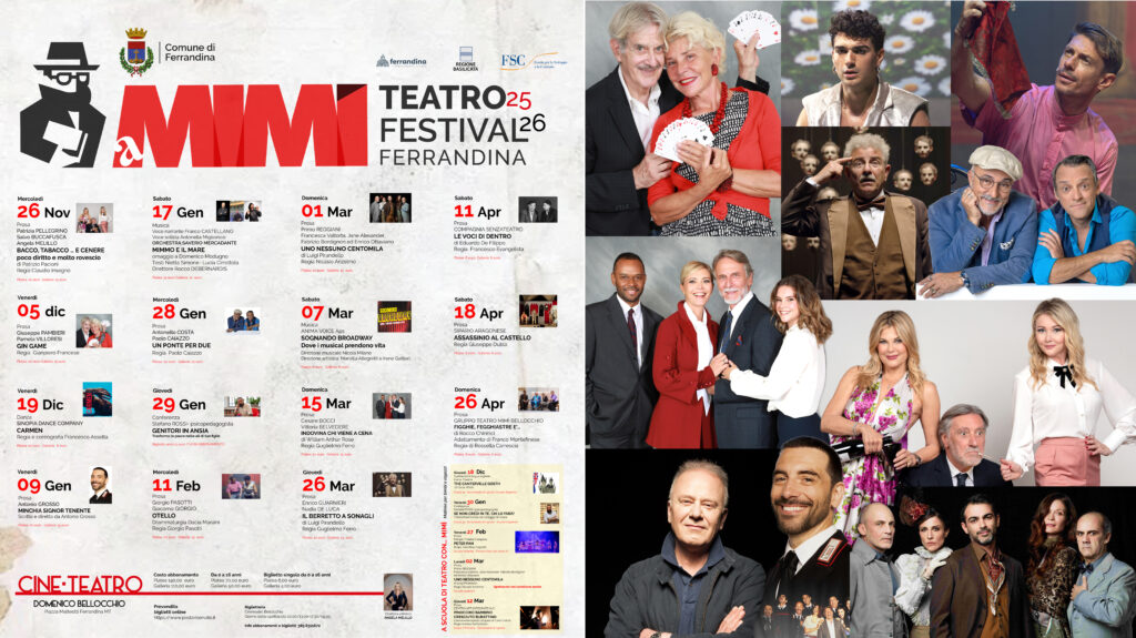 La magia del teatro torna a illuminare Ferrandina con la nuova stagione del Teatro Festival “A Mimì” 2025/26, dedicata al poeta e drammaturgo Bellocchio. Un cartellone ricco e di altissimo livello accompagnerà il pubblico da novembre ad aprile, con 15 appuntamenti tra prosa, danza, musica e incontri culturali. Ad arricchire la stagione anche quest’anno cinque matinée gratuite per le scuole, dall’Infanzia alle Superiori: un’opportunità unica per avvicinare i più giovani al mondo del teatro e stimolare la loro curiosità.