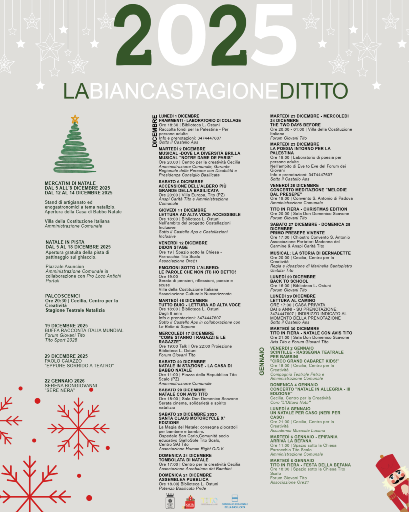L’Amministrazione Comunale di Tito ha presentato “La Bianca Stagione 2025”, il ricco calendario di eventi natalizi che per tutto il mese di dicembre e fino a gennaio 2026 animerà il territorio comunale. Un progetto culturale ambizioso che rappresenta un esempio virtuoso di collaborazione tra istituzioni, associazioni locali, operatori economici e cittadini.