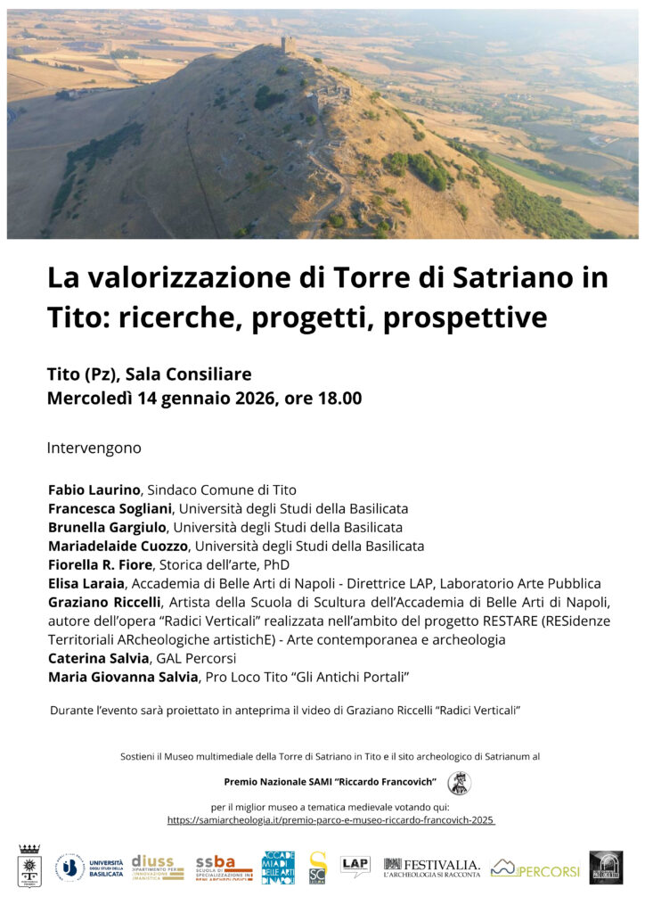 Un momento di confronto sulla valorizzazione della Torre di Satriano in Tito, candidata al Premio Nazionale “Riccardo Francovich” per il miglior museo o parco archeologico a tematica medievale, è al centro dell’incontro in programma mercoledì 14 gennaio 2026, alle ore 18.00, nella Sala Consiliare del Comune di Tito.