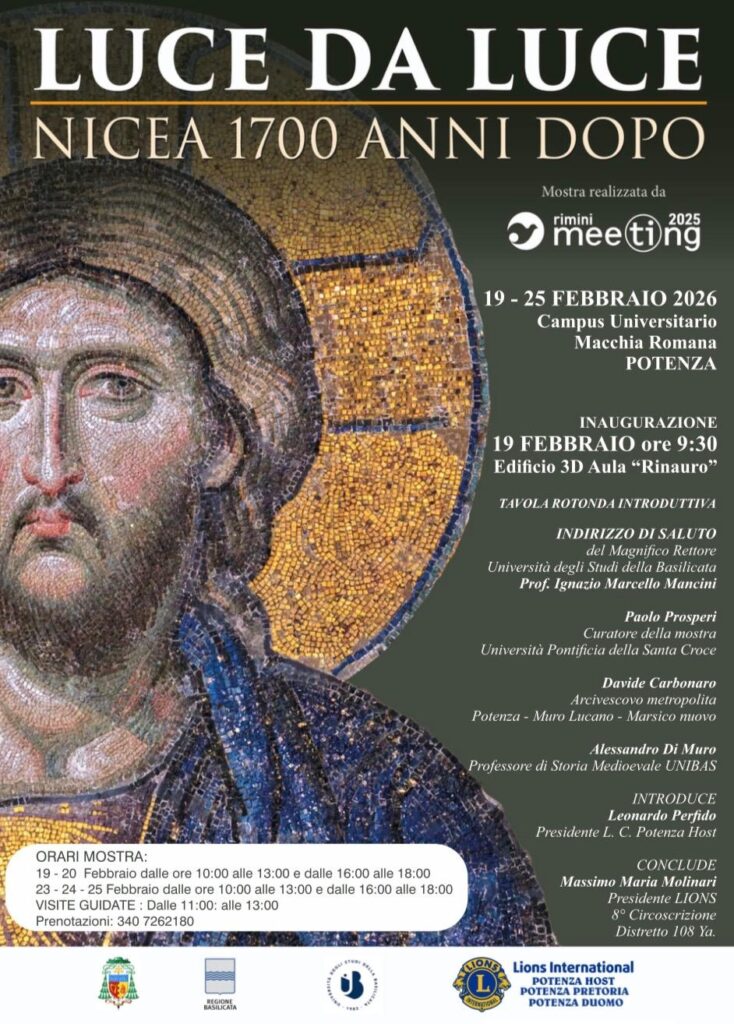 Dal 19 al 25 febbraio 2026 l’Università degli Studi della Basilicata ospiterà, presso il Campus Universitario di Macchia Romana, la mostra itinerante “Luce da Luce. Nicea 1700 anni dopo”, un percorso storico e spirituale dedicato al Concilio di Nicea (325 d.C.), evento che ha profondamente segnato la storia del cristianesimo e della civiltà occidentale.