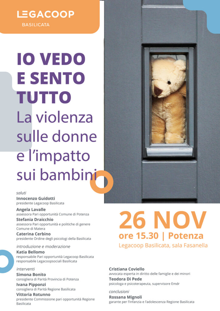 Guardare al drammatico tema della violenza sulle donne dall’angolazione delle bambine e dei bambini che assistono e subiscono così gravi conseguenze. È l’obiettivo dell’incontro “Io vedo e sento tutto”, organizzato da Legacoop Basilicata presso la sua sede regionale a Potenza, con la collaborazione della Commissione regionale Pari Opportunità, mercoledì 26 novembre alle ore 15.30, il giorno successivo alla giornata internazionale contro la violenza di genere.