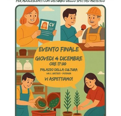Il 4 dicembre 2025, dalle ore 17.00, nel Palazzo della Cultura a Potenza si svolgerà l’evento conclusivo del progetto “I colori dell’Autonomia: Laboratori sperimentali per l’inclusione sociale e lavorativa per adolescenti con disturbo dello spettro autistico”.