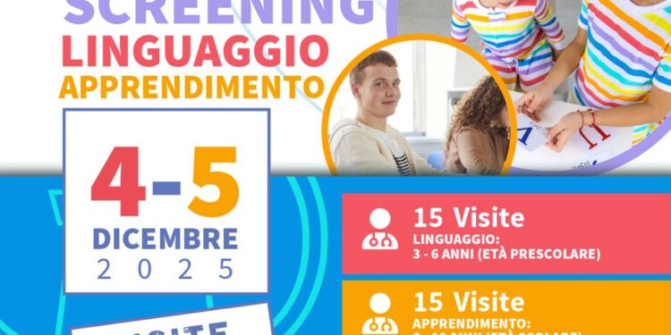 Sono previsti screening per disturbo di linguaggio e apprendimento in età evolutiva (dai 3 ai 18 anni) il 4 e 5 dicembre. Per partecipare alle visite gratuite è necessario prenotarsi online. Le registrazioni sono aperte dalle ore 7 alle 18 dell’1 dicembre.
