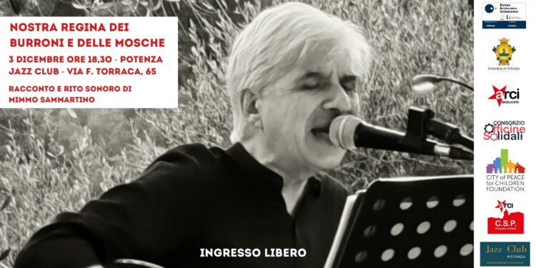 Il 3 dicembre alle 18,30 al Jazz Club che ha sede in Via Torraca, 46 a Potenza e l’11 dicembre alle 18,00 nella sede del Circolo Arci Pasquale Critone a Sant’Arcangelo monologo teatrale “Nostra Regina dei burroni e delle mosche” di Mimmo Sammartino.
