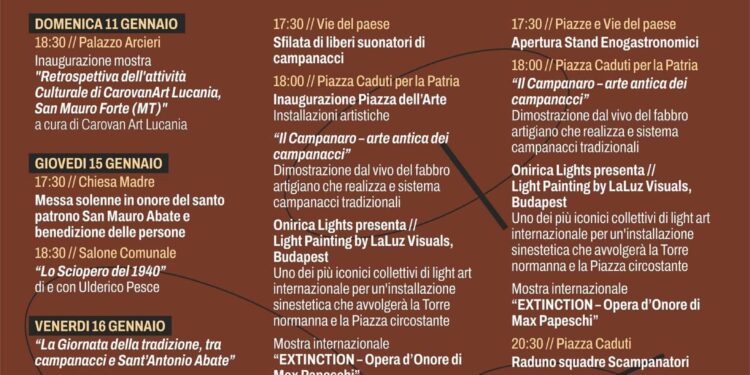 Il 16 e 17 gennaio si rinnova la sinergia tra l’antica tradizione dell’evento, da quest’anno riconosciuto dal Ministero della Cultura come Carnevale storico e il Festival Onirica/Lights, un progetto artistico itinerante. Protagonista la tradizionale sfilata delle squadre di scampanatori.