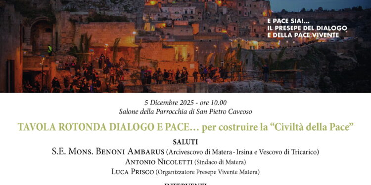 Le diocesi di Matera-Irsina e di Tricarico promuovono, all’inizio dell’Avvento e nel giorno inaugurale del Presepe vivente di Matera, la tavola rotonda “Dialogo e Pace… per costruire la Civiltà della Pace”, in programma venerdì 5 dicembre alle ore 10 a Matera.