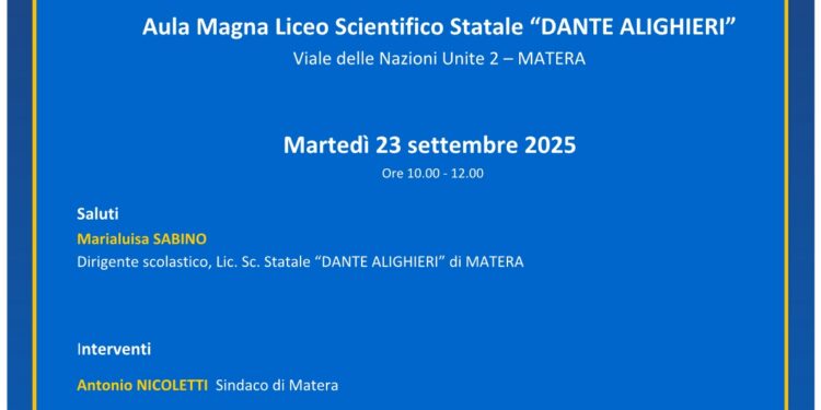 Domani, dalle ore 10.00 alle 12.00, nell’Aula Magna del Liceo Scientifico “Dante Alighieri”, la cerimonia che darà ufficialmente il via al nuovo percorso formativo per centinaia di studenti materani. Un momento di incontro tra scuola, istituzioni e territorio