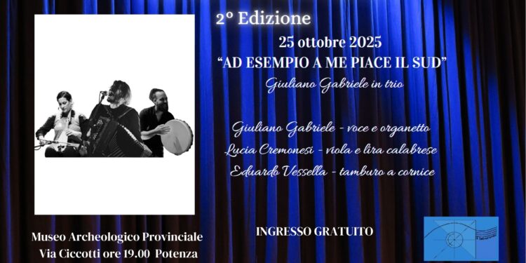 Per la rassegna promossa dall’Associazione “il tetracordo” in scena un concerto di musica etnica dal titolo “Ad esempio a me piace il Sud” con il trio formato da Giuliano Gabriele (voce e organetto), Lucia Cremonesi (viola e lira calabrese) ed Eduardo Vessella (tamburo a cornice)