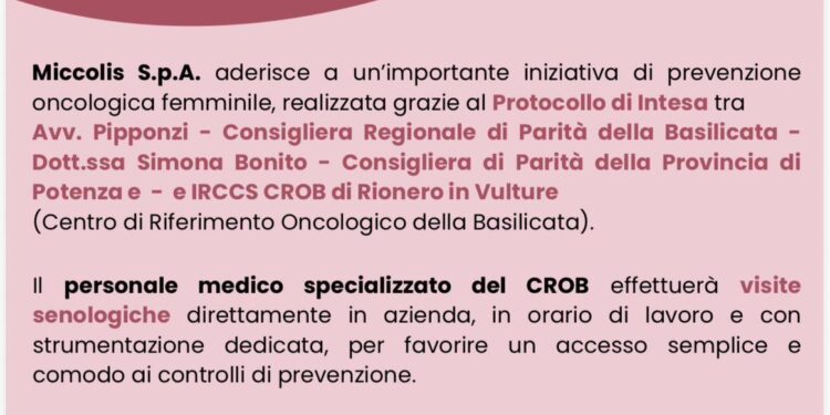 Questa mattina, nella sede dell’azienda Miccolis, hanno preso ufficialmente avvio le attività previste dal protocollo d’intesa sottoscritto tra l’Irccs Centro di Riferimento Oncologico della Basilicata e le Consigliere di Parità regionale e provinciale.