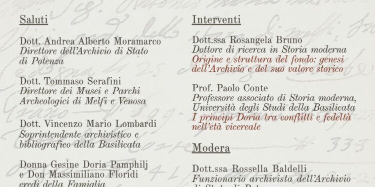 L’Archivio di Stato di Potenza ospiterà lunedì 17 novembre 2025, alle ore 17.00, un convegno di studi dedicato all’“Azienda Doria”, prezioso fondo documentario che testimonia la lunga storia gestionale dei principi Doria Pamphilj nell’antico stato di Melfi.