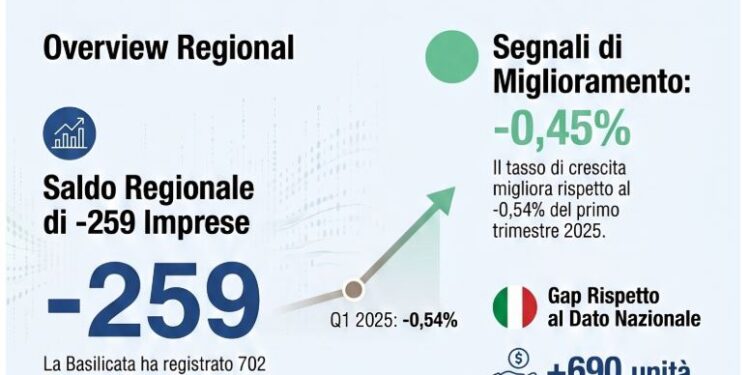 Nel primo trimestre 2026 si attenua la flessione delle aziende in termini di nati-mortalità. Nonostante un saldo ancora negativo, la Basilicata mostra un lieve miglioramento nel tasso di crescita rispetto allo scorso anno, inserendosi in un contesto meridionale che torna a correre.